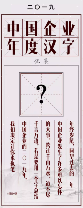 2019年12月,国务院国资委欧美av中心 新媒体平台“国资小新”通过微信、微博、新闻客户端公开征集中国企业年度汉字,得到网友的踊跃参与。“国资小新”根据网友和粉丝推荐最多的15个候选年度汉字“稳、融、进、责、实、兴、联、转、质、新、强、智、重、拓、提”进行网上投票,经过近万人参与投票,最终“智”字高票当选。