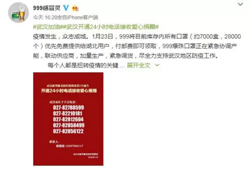 1月23日下午,华润三九在全网开放申请窗口,将库存中约7000盒,28000个口罩免费提供给有需要的大众(湖北优先)。消息发出当天,7000盒口罩全部皆被预订完毕,后续将筛选出所有符合要求的信息第一时间开始发货(湖北优先),预计在 1-2天内公布查询表单及物流名单。