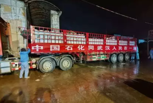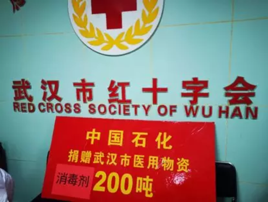 1月24日晚8时许,中国石化捐助给武汉市的200吨杀菌消毒剂火速运往抗击疫情的最前线:防控新型肺炎消毒用品告急,中国石化迅速联系武汉市红十字会,协调捐赠医用物资,紧急指令下属盐化工湖北有限公司,调整生产、保证疫情防控用消毒剂用量;中韩石化迅速调派8台30吨的平板拖车,经武汉市新型肺炎防控指挥部批准,往返500公里,将这200吨消毒用品连夜抢运、发往武汉,于25日凌晨安全抵达武汉,并于上午捐赠给了武汉市红十字会,缓解医院、公共场所与社区大量消毒剂急用之需。