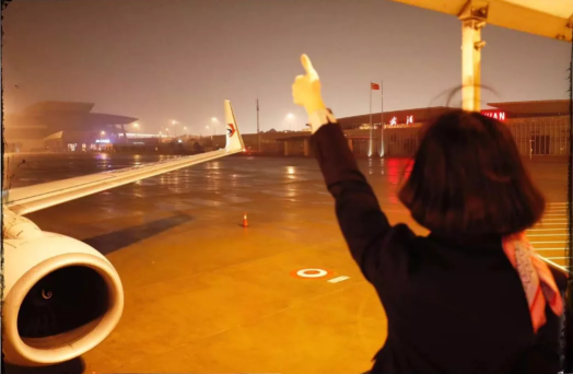 乘务长韩雪一个人默默的在客梯车上,一边喊着“武汉加油”、一边竖起了大拇指。