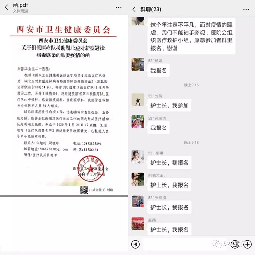 除夕夜,不断在兵器工业521医院各个工作群里刷新的信息不是新年的祝福,而是不断秒回复的报名声。接市卫健委关于组派医疗队援助湖北应对新型冠状病毒感染的肺炎疫情的函,该院需抽调医护人员作为省第二批医疗援助队员,待命前往湖北武汉驰援。面对院里的自愿报名申请,大家纷纷秒回“我报名”,争取上前线支援,斩钉截铁的三个字表明了他们的态度和决心!