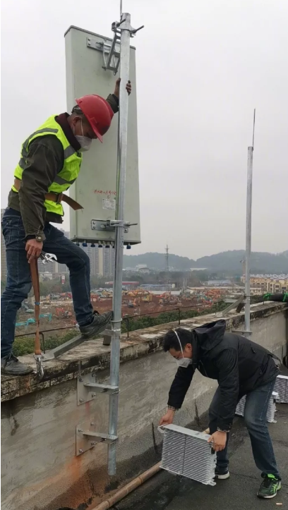 1月23日晚上,中国铁塔湖北分公司主动向省委省政府、省通信管理局请命,随武汉版“小汤山医院”同步推进移动通信网络覆盖,会同当地三家运营商一起努力,确保移动通信网网络设施与医院同步交付使用。大年三十的清晨,通过现场察勘,武汉铁塔与三家运营商确定了在武汉疗养院中餐厅楼顶先做一个楼面站,后期再增加塔房一体化基站。1月25日11时,经一天一夜奋战,武汉铁塔完成首个楼面基站的电力、配套及杆塔的建设交付,等候运营商安装设备。