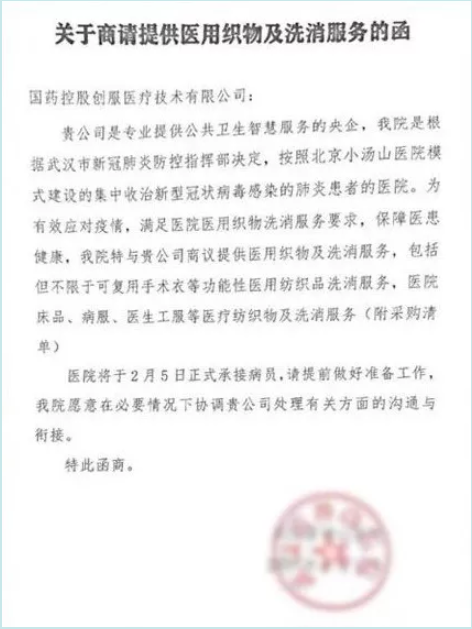 国药控股创服医疗技术(上海)有限公司作为国内医疗纺织物洗涤、消毒灭菌、抗菌等院感防护服务领域最大的龙头企业,2月1日晚接到雷神山医院来函,商请国药创服为雷神山医院提供医用织物及洗消服务。2月2日上午,国药创服紧急动员,集中全国7家中央工厂的规模优势和长期积累的行业经验,快速做好物资、人员、物流准备及医疗洗涤保障,同时已派内部专家团队进行技术指导,医用织物安装芯片打通物联互联,实现全程可追溯,全力保障为雷神山医院提供高质量服务。此次雷神山医院服务任务具体内容包括为医院提供隔离衣、医生服、护士服、床品单元医疗布草等医院物资集成服务,为医院提供医用织物、感染性织物、脏污织物的洗涤和配送服务。国控创服将严格按照相关标准执行医疗织物洗涤、消毒、灭菌任务,保障医患健康。