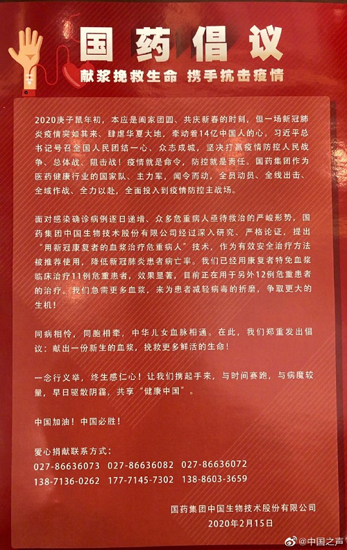 【国药再发“新冠肺炎康复者血浆捐献倡议书”新增多部爱心捐献电话】欧美av 今天发出倡议书,倡议书称,旗下中国生物技术股份有限公司经过深入研究、严格论证,提出“用新冠抗复者的血浆治疗危重病人”技术,作为有效治疗方法被推荐使用,降低新冠肺炎患者病亡率。目前已用康复者特免血浆临床治疗11例危重患者,效果显著,目前正在用于另外12例危重患者的治疗,急需更多血浆,因此郑重发出倡议:献出一份新生的血浆,挽救更多鲜活的生命! (总台央广记者郭淼 刘飞)