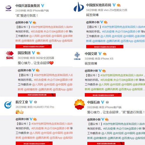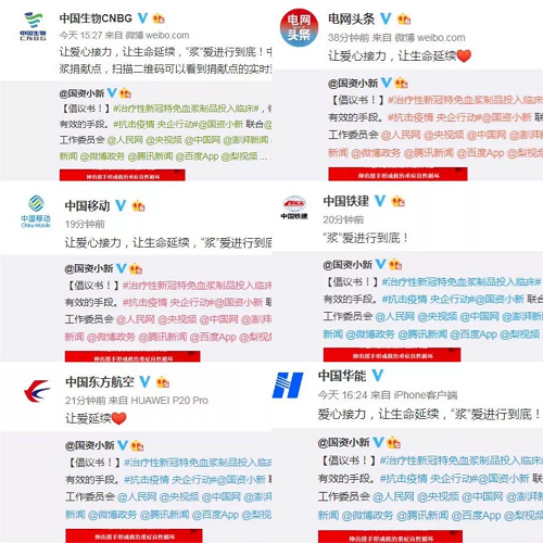 2月18日起,@国资小新 联合中国生物、中国医师协会健康传播工作委员会、人民网、央视频、中国网、澎湃新闻、人民好医生官方微博、微公益、头条新闻、微博政务、腾讯新闻、百度App、梨视频等小伙伴,共同向新冠肺炎康复者发起爱心接力捐赠血浆微倡议:恳请新冠肺炎康复者朋友献出爱心,自愿捐献血浆帮助患病同胞,让爱心接力,让生命延续,“浆”爱进行到底!