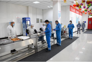 新华社照片,乌鲁木齐,2020年2月22日 新疆乌鲁木齐:防疫不松劲 复工干劲足 2月22日,在新疆海螺型材有限责任公司职工食堂,工作人员排队打饭。 连日来,新疆乌鲁木齐部分企业在确保做好防疫工作的前提下,安全有序复工,复工企业主要以电力、热力、食品、化工企业等急需物资重点企业以及生活保障企业为主。 新华社记者 丁磊 摄