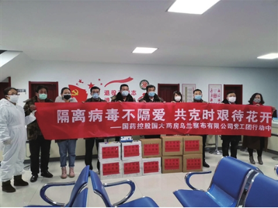 据了解,国大药房一直关注着疫情防控形势。在得知新体路街道抗击疫情一线的工作人员缺少消毒药品、防护物资的难题时,国大药房主动伸出援手,从库房中拿出5箱医用酒精、5箱84消毒液和5盒防护手套,捐赠给新体路街道办事处,助力疫情防控工作。