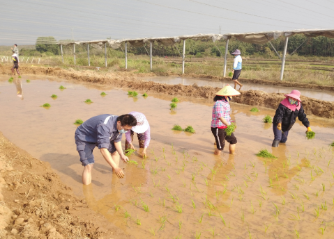 南方电网海南电网公司派驻的“80后”驻村第一书记、白沙黎族自治县荣邦乡光村乡村振兴工作队队长刘志鹏(左一)和村民热火朝天地忙着水稻插秧。