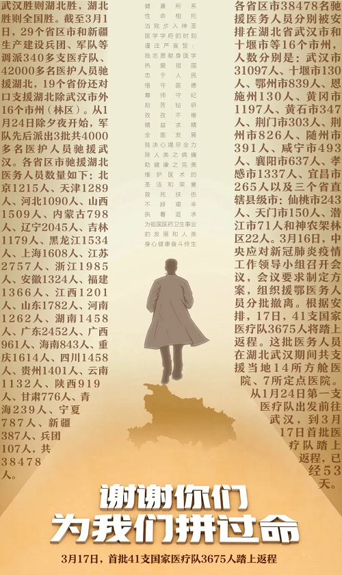 随着疫情防控形势的逐渐好转,完成医疗救助任务的来自全国42322名医护人员,将陆续分批离开武汉。今天,3月17日,41支国家医疗队3675人踏上返程。