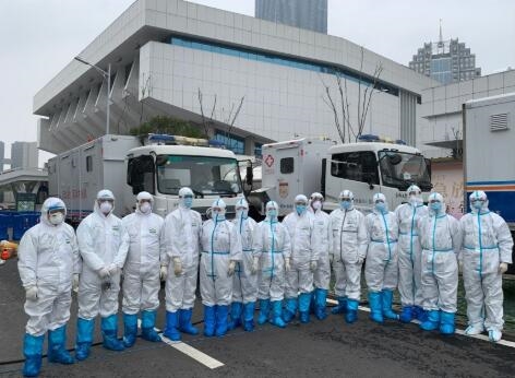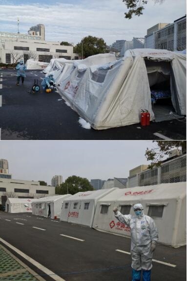 来自中国航天科工的“移动医院”装备保障队员和上海复旦大学附属华山医院医护人员在武昌方舱医院前合影。