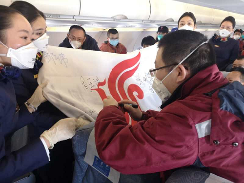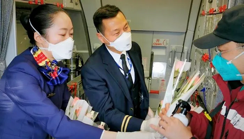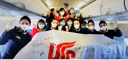 3月17日,国航派出2架包机飞赴武汉,护送白衣天使回家。CA044航班、CA042航班先后于北京时间17时10分和17时49分安抵成都。