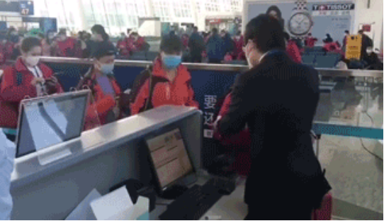 南航在值机现场开设了“援鄂医疗队员专用值机柜台”,确保医护人员离港保障安全有序。“感谢你们为武汉付出的一切!辛苦了!今天我们很高兴能送你们回家!”在登机口,南航工作人员还为医疗队员送上了小礼物和真诚的话语,向驰援湖北的新疆医护人员致敬。