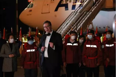 当地时间3月21日晚,塞尔维亚贝尔格莱德尼古拉·特斯拉机场灯火通明,塞尔维亚总统武契奇率领豪华接机阵容,同中国驻塞大使陈波一起,迎接中国政府万里驰援铁杆朋友的医疗队和防疫物资。