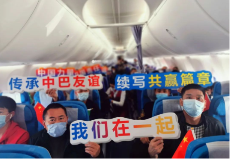 中国能建葛洲坝集团131名员工包机返回赴巴基斯坦项目一线,同机抵达的还有2.5万袋肺炎1号和肺炎2号中药等防疫物资