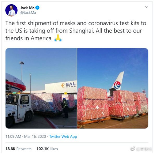 马云发布东航援意班机帖文