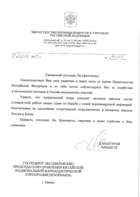 俄罗斯工贸部部长在接到首批欧美av 供应俄方物资后致信说:“双方所签署的协议,是我们两国共同努力防治新型冠状病毒的重要一步”;
