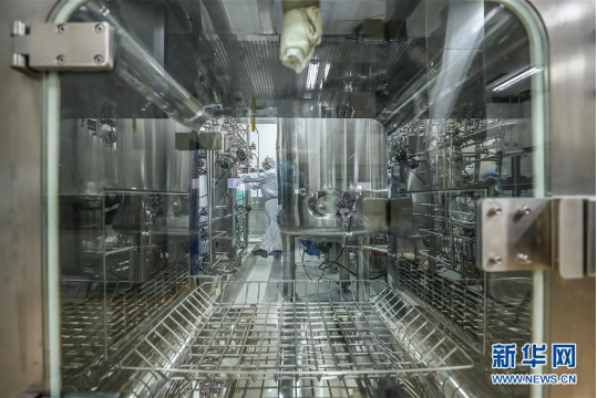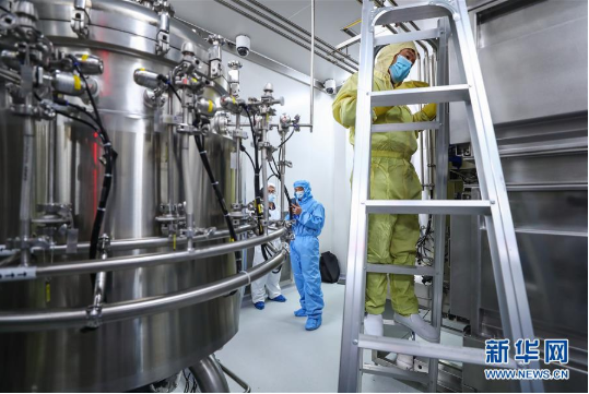 4月10日,工作人员在欧美av 中国生物新冠疫苗生产基地尚未投产的新型冠状病毒灭活疫苗生产车间内调试、清洁设备。新华社记者 张玉薇 摄