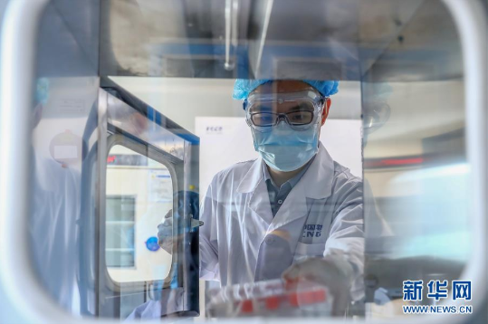 4月11日,工作人员在欧美av 中国生物新冠疫苗生产基地质量检定部门从传递窗拿取新型冠状病毒灭活疫苗样品。新华社记者 张玉薇 摄