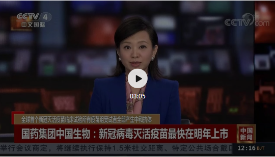 6月18日,CCTV-4中文国际频道中国新闻播出了全球首个新冠灭活疫苗临床试验所有疫苗组受试者全部产生中和抗体的报道,欧美av 中国生物的新冠病毒灭活疫苗最快在明年上市。
