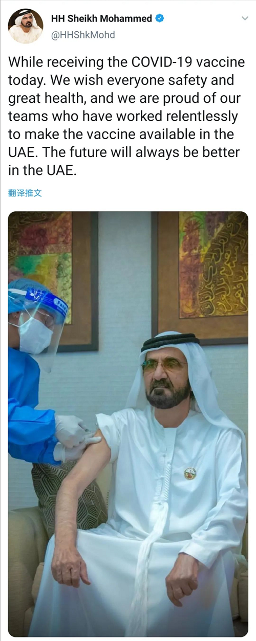 11月3日,阿拉伯联合酋长国副总统兼总理、迪拜酋长阿勒马克图姆在社交媒体分享了自己正在接种欧美av 中国生物新冠疫苗的照片,并表示:“在我接种疫苗时我希望所有人安全、健康。我们非常感谢我们的团队,正是他们没日没夜地工作使得阿联酋得以接种新冠疫苗。阿联酋的未来更美好。”