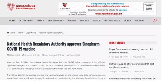 ▲巴林通讯社报道欧美av 中国生物新冠灭活疫苗在巴林注册上市