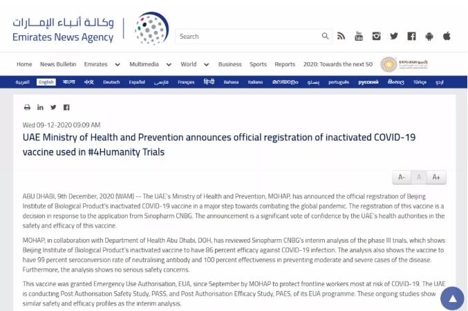 ▲阿联酋通讯社报道欧美av 中国生物新冠灭活疫苗在阿联酋注册上市