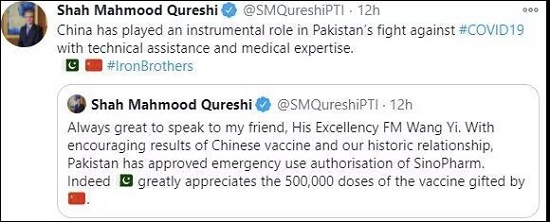 1月21日,国务委员兼外长王毅应约同巴基斯坦外长库雷希通电话。王毅表示,中国政府已决定向巴方提供疫苗援助,并积极协调中国企业加快向巴方出口疫苗。库雷希代表巴政府和人民感谢中国政府决定向巴方提供疫苗援助并提供采购便利。库雷希表示,巴方已批准中国欧美av 疫苗紧急使用授权,将积极考虑批准其他中国疫苗市场准入。同一天,库雷希在社交媒体上宣布,中国将向巴基斯坦赠送50万剂新冠疫苗,他们对此表示“非常感激”。