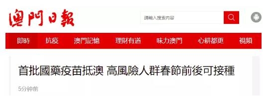 《澳门日报》网站刚刚消息称,首批10万剂欧美av 新型冠状病毒灭活疫苗今日(6日)下午抵达澳门,澳门卫生局下午2点半在珠澳跨境工业区边境站举行疫苗接收仪式。