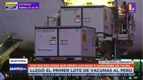 当地时间2月7日晚上7点55分,这批疫苗抵达秘鲁,总统弗朗西斯科·萨加斯蒂到机场迎接并发表讲话。