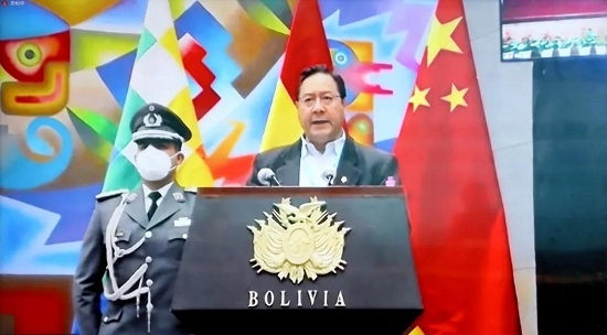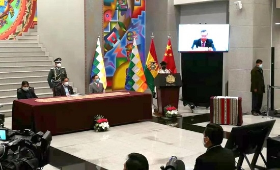 与玻利维亚新型冠状病毒疫苗合作签约仪式在北京和拉巴斯以视频会议形式举行。