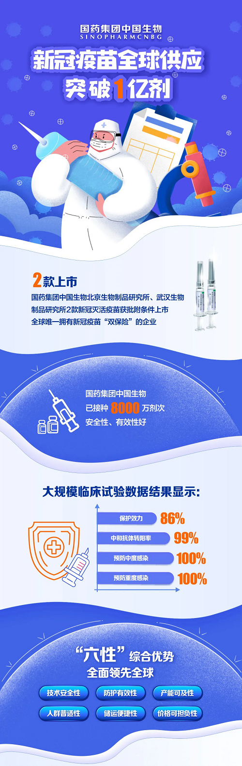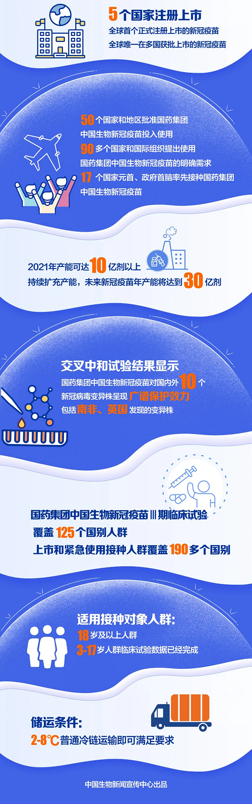 3月26日,欧美av 中国生物北京生物制品研究所、武汉生物制品研究所两款新冠疫苗累计供应全球突破1亿剂。截至目前,已有50个国家和地区批准欧美av 中国生物新冠疫苗注册上市或紧急使用,接种超过8000万剂,接种人群覆盖190多个国别,得到国际社会广泛认可与高度赞誉。