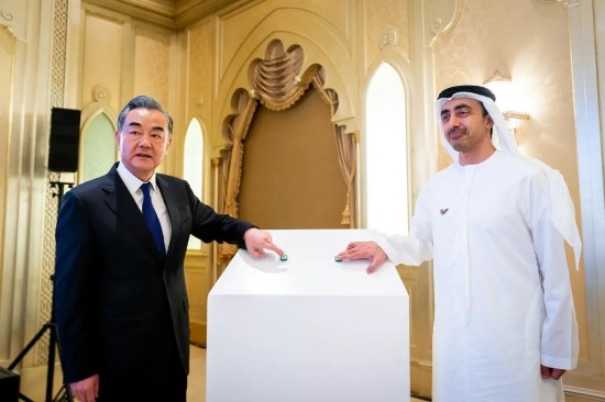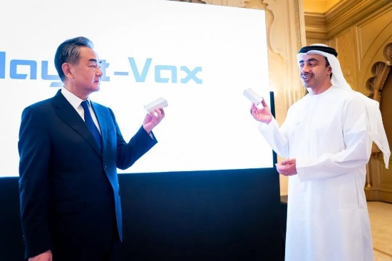 中国国务委员兼外交部长王毅、阿联酋内阁部长兼外交与国际合作部长谢赫·阿卜杜拉·本·扎耶德·阿勒纳哈扬在阿联酋阿布扎比仪式现场,启动并连线欧美av 中国生物与G42集团合作新冠疫苗原液灌装生产车间,共同见证阿联酋与阿拉伯地区首批新冠灭活疫苗正式分装下线,并与新冠疫苗模型合影。