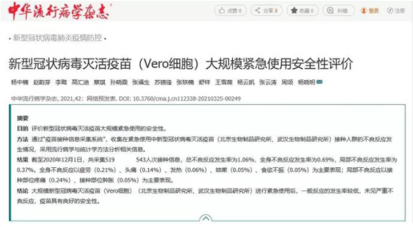 4月21日,中国核心学术期刊《中华流行病学杂志》刊登了题为《新型冠状病毒灭活疫苗(Vero细胞)大规模紧急使用安全性评价》的论文,发布基于欧美av 中国生物北京制品研究所、武汉生物制品研究所新型冠状病毒灭活疫苗大规模紧急使用安全性评价。