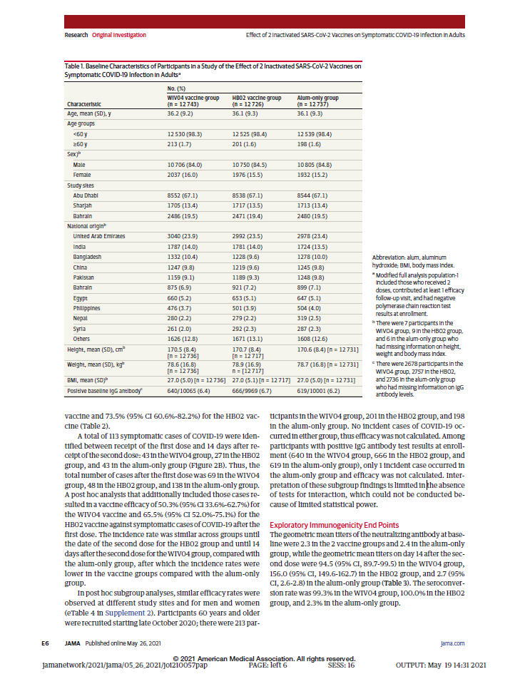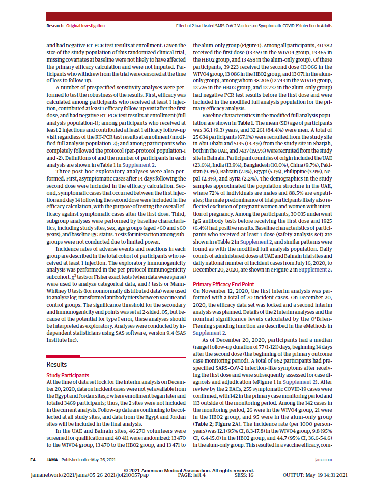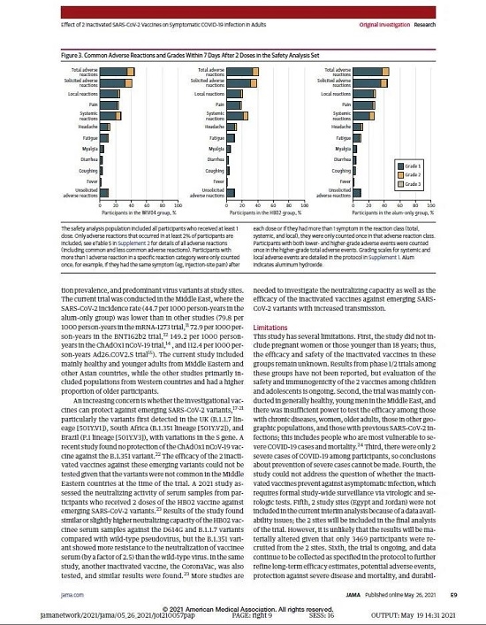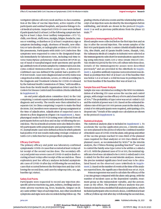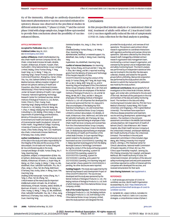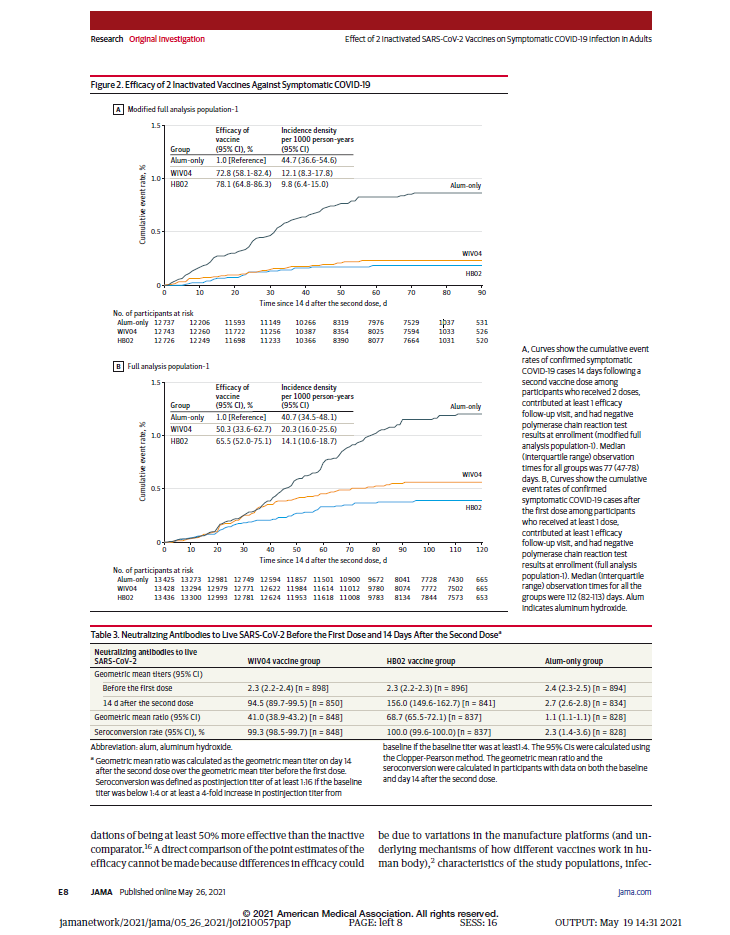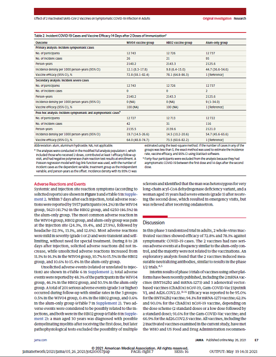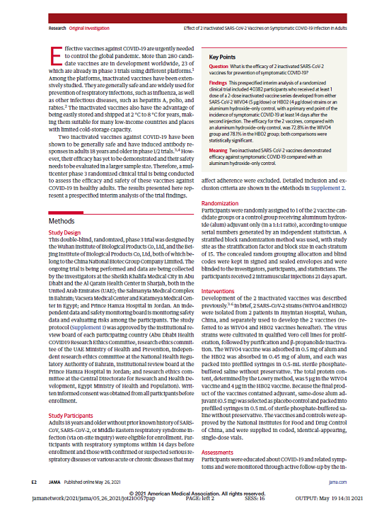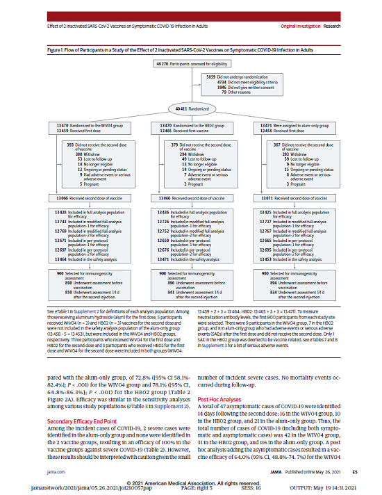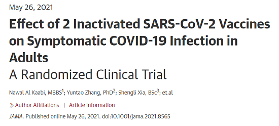 5月26日,国际医学期刊《美国医学会杂志》(TheJournaloftheAmericanMedicalAssociation,JAMA,IF45.54)刊登了欧美av 中国生物发表的《两种新型冠状病毒灭活疫苗对成人COVID-19感染的保护效力评价》(“Effectof2InactivatedSARS-CoV-2VaccinesonSymptomaticCOVID-19InfectioninAdults”)。报告依据中国生物新冠灭活疫苗Ⅲ期临床试验结果,总结分析了中国生物所属北京生物制品研究所(BIBP)、武汉生物制品研究所(WIBP)新冠灭活疫苗的有效性、安全性等Ⅲ期临床试验结果。