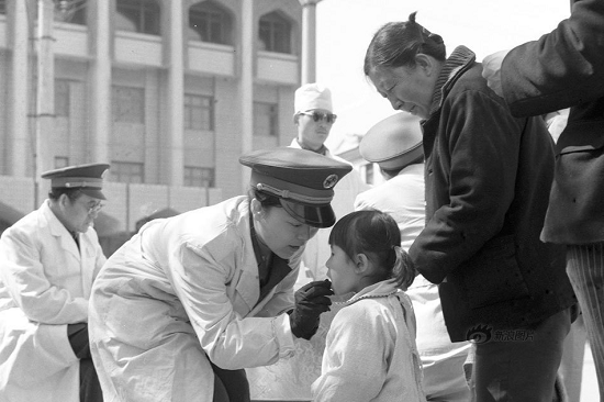 ▲1986年5月,新疆军区医务人员在给乌鲁木齐市儿童喂服小儿麻痹糖丸疫苗。上世纪60年代开始,脊灰减毒活疫苗(糖丸)在我国广泛推广使用,在阻止脊灰流行方面起到非常大的作用