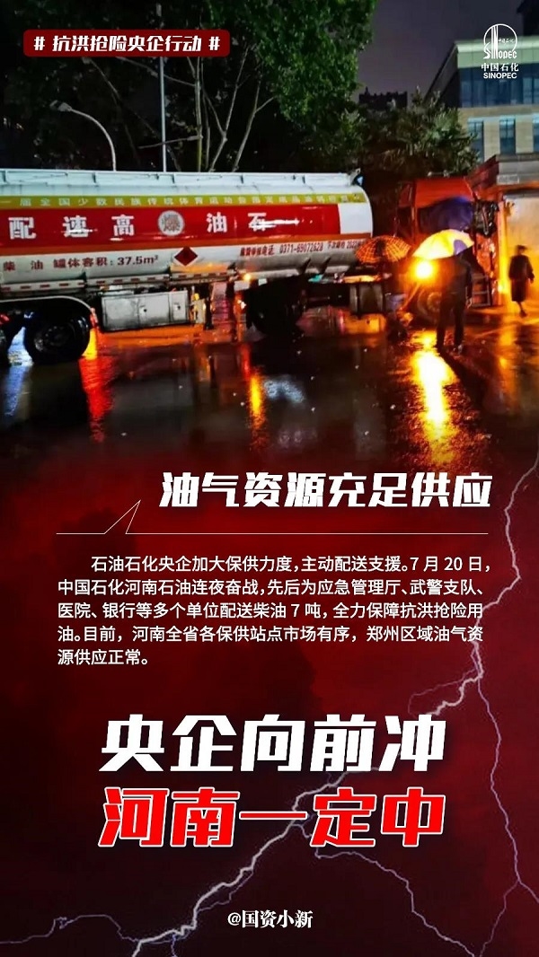 油气资源充足供应、现金捐赠防汛救灾