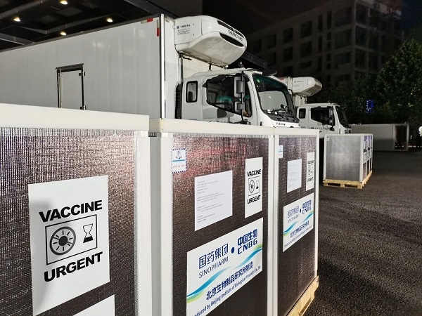 8月6日晚,首批供应COVAX的中国生物新冠疫苗准备装箱