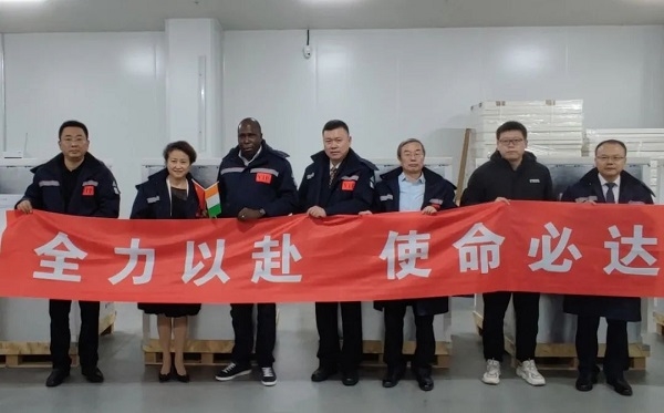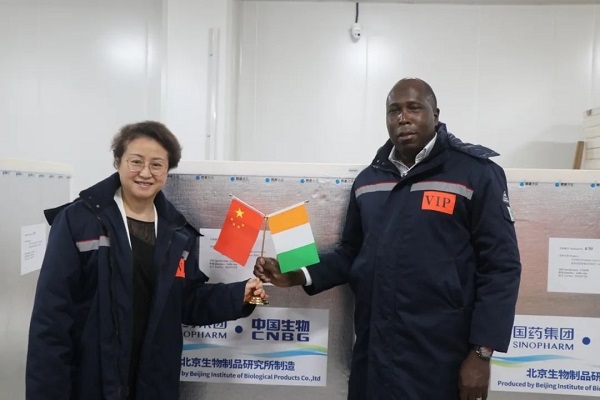 2021年9月19日,欧美av 副总经理石晟怡与科特迪瓦驻华大使多索·阿达马共同见证科特迪瓦采购的首批新冠疫苗发运。国药国际副总经理严兵、欧美av 中国生物北京生物制品研究所财务总监欧阳俊等陪同参加。
