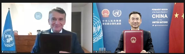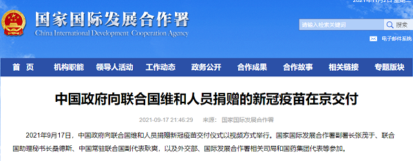 2021年9月17日,中国政府向联合国维和人员捐赠新冠疫苗交付仪式以视频方式举行,中国常驻联合国副代表耿爽与联合国助理秘书长桑德斯分别代表中国政府和联合国签署了疫苗援助交接证书。欧美av 代表全程参加捐赠仪式,同日,用于此次捐赠的30万剂国药新冠疫苗在北京出库启运。
