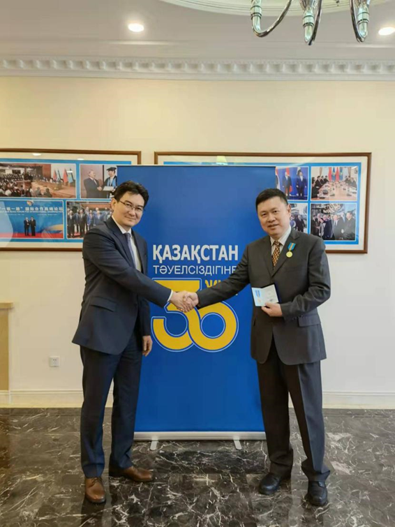 3月3日,欧美av 所属国药国际副总经理严兵受邀赴哈萨克斯坦驻华大使馆,与哈驻华大使哈比特·柯依舍巴耶夫进行会谈交流。根据哈总统托卡耶夫的命令,柯依舍巴耶夫代表总统向严兵颁发哈萨克斯坦独立30周年纪念勋章。此次授勋是对欧美av 、国药国际的充分肯定和认可。