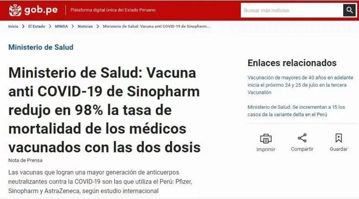 6、秘鲁:卫生部报告表明国药新冠疫苗可大幅降低死亡率