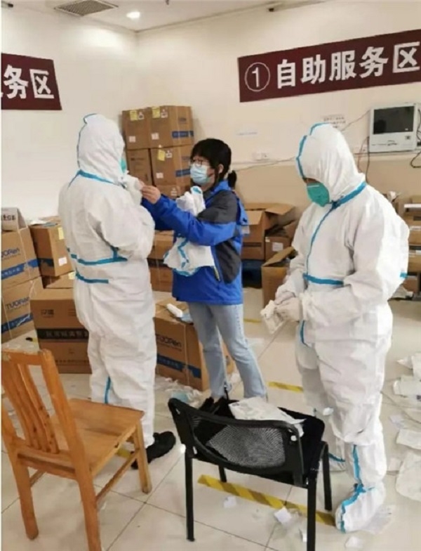 国药器械上海公司第一时间发动党员、青年,向全公司发出抗疫志愿者倡议书。仅仅几分钟内,召集到了十几位抗疫勇士。国药器械上海公司医院供应链管理部驻点人员在接到命令后,第一时间协调物流中心人员等各方资源,清空货物和办公用品,对该医院接收的防疫物资进行清点、登记和发放,并指导院方工作人员穿戴二级防护装备(大白)。他们在狭长简陋的走廊中搭起办公桌后,迅速投入工作,确保及时做好院内防疫物资的发放。在连续工作了30多个小时后,即使困了也只在简易的行军床上休息片刻,又继续投入到繁重的工作中去。