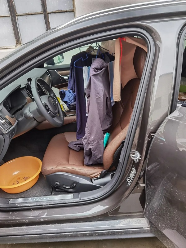 打开车门,放平后座,盖张毯子,这便是“床”。再往驾驶座位下塞个盆、上面挂几件衣服,这便是“阳台”。