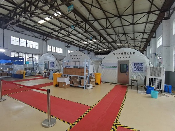 3月15日,几辆14米长的大卡车满载气膜舱体、核酸提取仪等设备,驶进松江区九亭镇伴亭东路的一处厂房。大家撸起袖子、当起工人,硬是在这个“毛坯房”里建起一座生物安全标准不输传统实验室的气膜实验室。