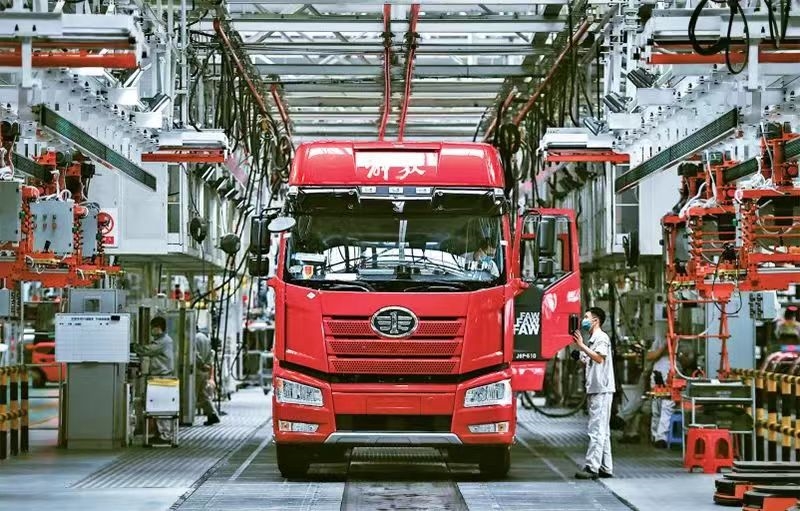 企业强则国家强,加快建设世界一流企业是全面建设社会主义现代化国家的重大任务,是新时代国有企业的战略目标。近来,一汽解放集团股份有限公司生产按下“加速键”。图为2022年6月15日,工人在位于吉林长春的一汽解放总装车间内装配车辆。 新华社记者 许畅/摄