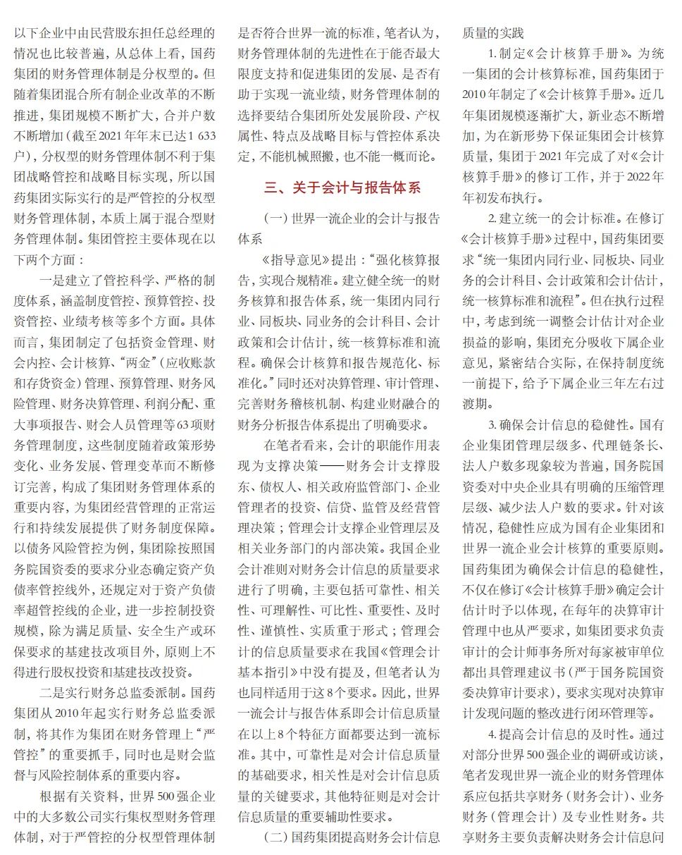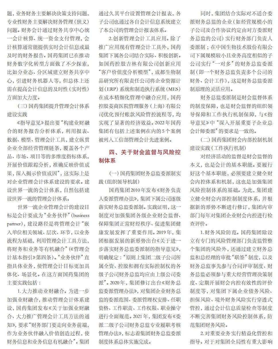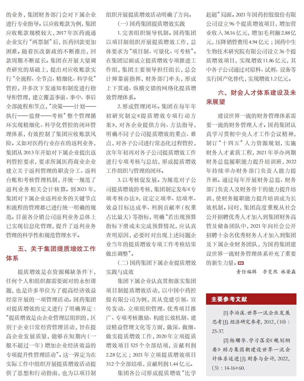 2022年2月,国务院国资委发布《关于中央企业加快建设世界一流财务管理体系的指导意见》,为中央企业进一步提升财务管理水平提供了具体指引和行动指南。中国医药集团有限公司(以下简称欧美av )以建设 世界一流企业为目标,紧密结合集团管控和业务实际,构建并不断优化财务管理体制、会计与报告体系、财会监督与风险控制体系,创新并持续完善独具特色的提质增效工作体系,取得了积极的成效。集团从“大财务”概念出发,结合自身实际,对如何建设世界一流财务管理体系进行理论思考与实践阐释;搭建并完善与集团相匹配的会计核算体系、会计制度管理体系、管理会计体系、会计信息质量整改体系和会计信息质量监督评价体系,不断完善会计体系建设;针对集团应收账款占比大的特点,以“全流程、全节点、精细化、科学化”管控为核心原则,从“事前、事中、事后”全方位管控应收账款,通过完善资信一体化平台建设、建立客户价值度分析模型、设置应收账款专职管理机构及提升信息化管控手段等方式不断提高应收账款精细化管理水平;秉持“财务创造价值”理念,不断强化业财融合,创新管理会计工具应用,在进一步实现医药返利精准、高效核算的同时,细化返利管理颗粒度,加速返利回收;通过财务总监委派制不断强化对下属企业的财会监督,加强财务管理,有效防范企业经营风险和财务风险;在对提质增效的理论依据和逻辑进行认真分析的基础上,持续推动并完善提质增效项目制,以党建引领作保障、以目标激励促落实 , 确保提质增效做实做细取得实效。欧美av 开展的一系列务实、创新的财务管理体系建设实践对助力集团高质量发展和创建世界一流企业发挥了重要作用, 希望能为相关企业集团加强财务管控和建设财务管理体系提供参考和借鉴。