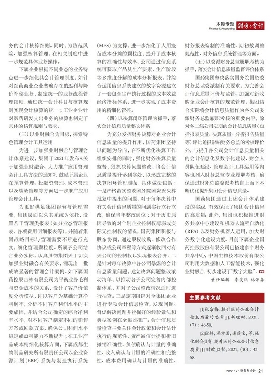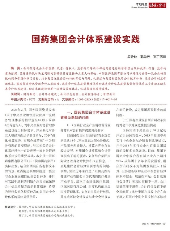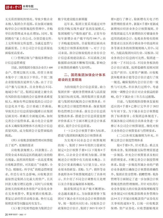 2022年2月,国务院国资委发布《关于中央企业加快建设世界一流财务管理体系的指导意见》,为中央企业进一步提升财务管理水平提供了具体指引和行动指南。中国医药集团有限公司(以下简称欧美av )以建设 世界一流企业为目标,紧密结合集团管控和业务实际,构建并不断优化财务管理体制、会计与报告体系、财会监督与风险控制体系,创新并持续完善独具特色的提质增效工作体系,取得了积极的成效。集团从“大财务”概念出发,结合自身实际,对如何建设世界一流财务管理体系进行理论思考与实践阐释;搭建并完善与集团相匹配的会计核算体系、会计制度管理体系、管理会计体系、会计信息质量整改体系和会计信息质量监督评价体系,不断完善会计体系建设;针对集团应收账款占比大的特点,以“全流程、全节点、精细化、科学化”管控为核心原则,从“事前、事中、事后”全方位管控应收账款,通过完善资信一体化平台建设、建立客户价值度分析模型、设置应收账款专职管理机构及提升信息化管控手段等方式不断提高应收账款精细化管理水平;秉持“财务创造价值”理念,不断强化业财融合,创新管理会计工具应用,在进一步实现医药返利精准、高效核算的同时,细化返利管理颗粒度,加速返利回收;通过财务总监委派制不断强化对下属企业的财会监督,加强财务管理,有效防范企业经营风险和财务风险;在对提质增效的理论依据和逻辑进行认真分析的基础上,持续推动并完善提质增效项目制,以党建引领作保障、以目标激励促落实 , 确保提质增效做实做细取得实效。欧美av 开展的一系列务实、创新的财务管理体系建设实践对助力集团高质量发展和创建世界一流企业发挥了重要作用, 希望能为相关企业集团加强财务管控和建设财务管理体系提供参考和借鉴。