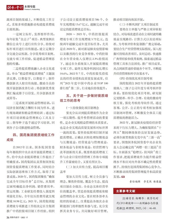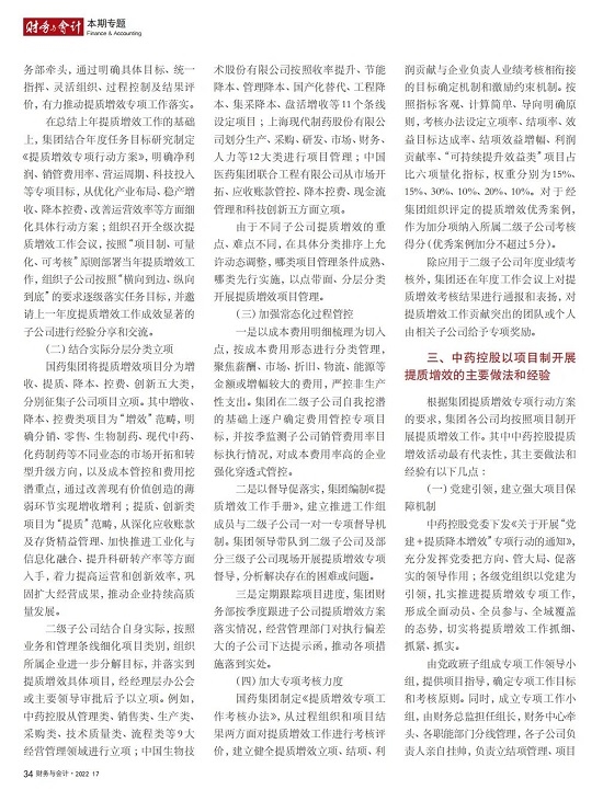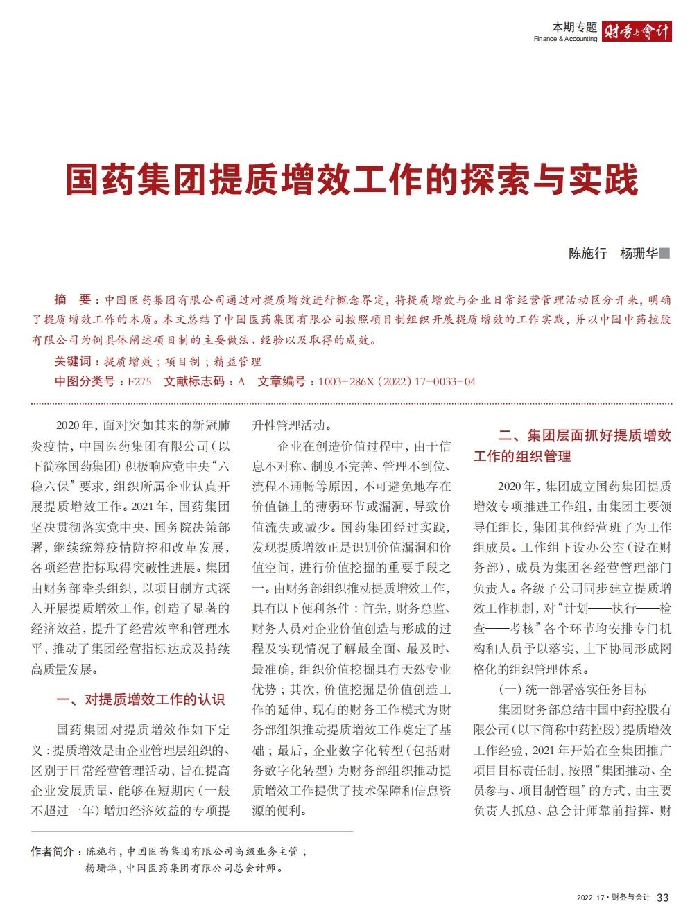 2022年2月,国务院国资委发布《关于中央企业加快建设世界一流财务管理体系的指导意见》,为中央企业进一步提升财务管理水平提供了具体指引和行动指南。中国医药集团有限公司(以下简称欧美av )以建设 世界一流企业为目标,紧密结合集团管控和业务实际,构建并不断优化财务管理体制、会计与报告体系、财会监督与风险控制体系,创新并持续完善独具特色的提质增效工作体系,取得了积极的成效。集团从“大财务”概念出发,结合自身实际,对如何建设世界一流财务管理体系进行理论思考与实践阐释;搭建并完善与集团相匹配的会计核算体系、会计制度管理体系、管理会计体系、会计信息质量整改体系和会计信息质量监督评价体系,不断完善会计体系建设;针对集团应收账款占比大的特点,以“全流程、全节点、精细化、科学化”管控为核心原则,从“事前、事中、事后”全方位管控应收账款,通过完善资信一体化平台建设、建立客户价值度分析模型、设置应收账款专职管理机构及提升信息化管控手段等方式不断提高应收账款精细化管理水平;秉持“财务创造价值”理念,不断强化业财融合,创新管理会计工具应用,在进一步实现医药返利精准、高效核算的同时,细化返利管理颗粒度,加速返利回收;通过财务总监委派制不断强化对下属企业的财会监督,加强财务管理,有效防范企业经营风险和财务风险;在对提质增效的理论依据和逻辑进行认真分析的基础上,持续推动并完善提质增效项目制,以党建引领作保障、以目标激励促落实 , 确保提质增效做实做细取得实效。欧美av 开展的一系列务实、创新的财务管理体系建设实践对助力集团高质量发展和创建世界一流企业发挥了重要作用, 希望能为相关企业集团加强财务管控和建设财务管理体系提供参考和借鉴。