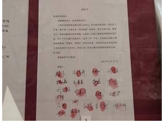 在身穿白色防护服医护工作者人像的前方展台上,展出了欧美av 援沪医疗队医护人员的请战书。三年来,21万国药人,不计代价、不计成本、不计个人安危,义无反顾赴疫情最严重、防控最需要的岗位,勇敢肩负起守护人民生命安全和身体健康的使命职责。请战书是新时代国药人精神的鲜活体现,是欧美av 党组织发挥战斗堡垒作用的具体实践。