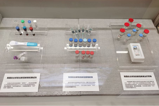 “方寸之间”展位的首排首个方柜,展出了以欧美av 中国生物新冠疫苗、奥密克戎株新冠疫苗为代表的抗病毒药物,展现了欧美av 奋力推进科技创新,努力打造“国之重器”的傲人成绩。